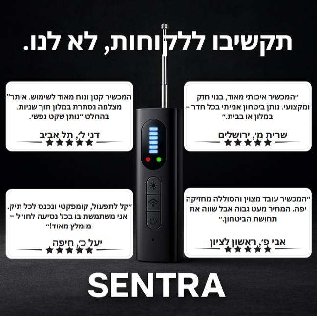 מטיילים שנסעו עם SENTRA™ סיפרו שהצליחו לאתר מצלמות נסתרות ומכשירי ריגול שהוסתרו היטב, וחסכו לעצמם סיכונים מיותרים.